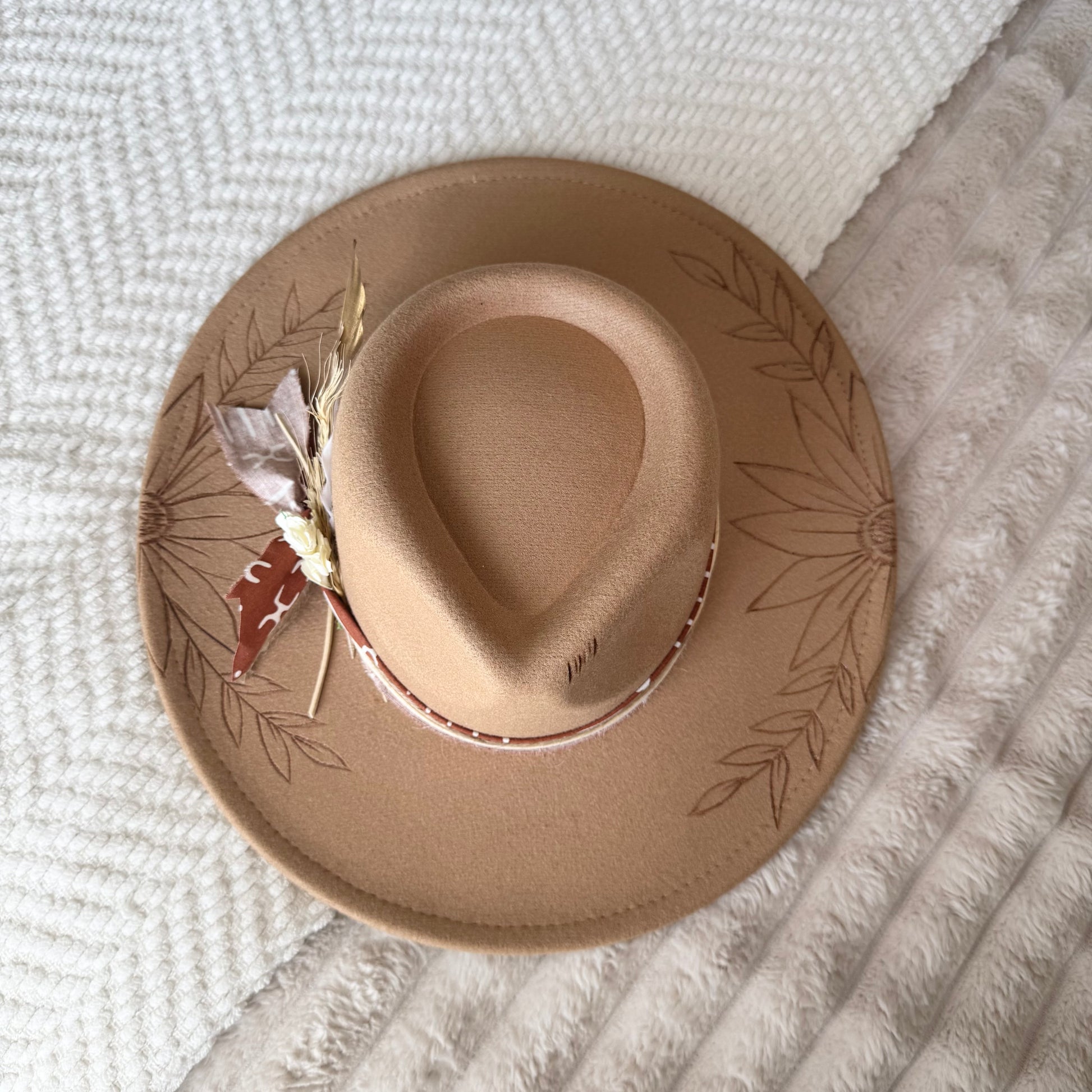 Hand drawn/ burned. Uniquely trimmed. This one of a kind hat is absolutely eye catching!