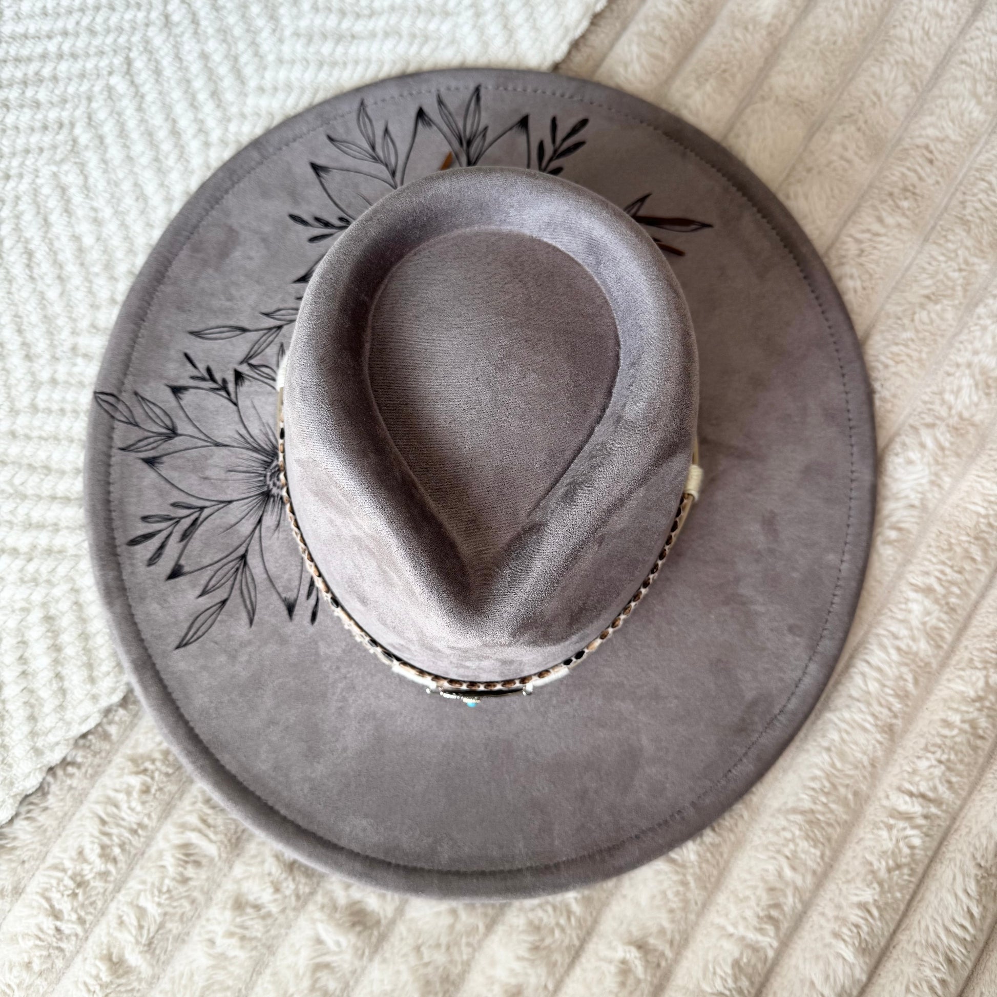Hand drawn/ burned. Uniquely trimmed. This one of a kind hat is absolutely eye catching!
