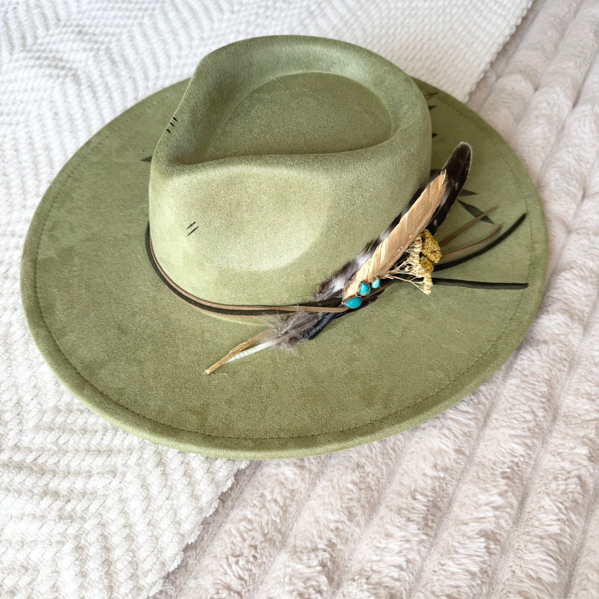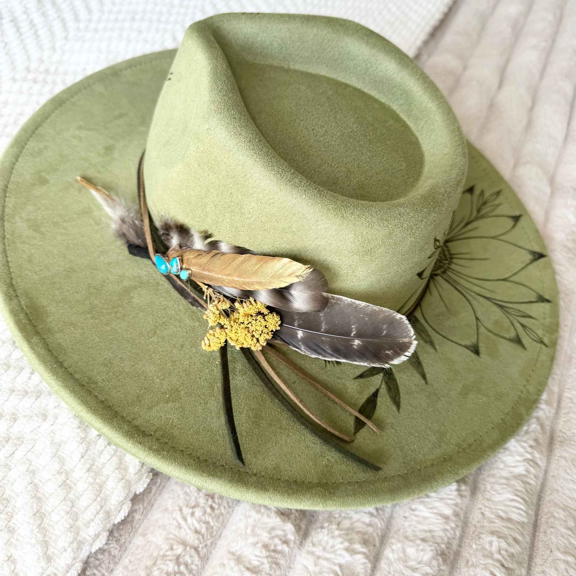 Hand drawn/ burned. Uniquely trimmed. This one of a kind hat is absolutely eye catching!