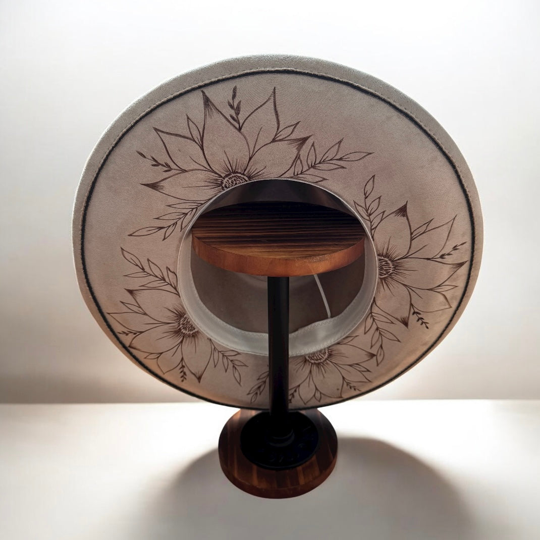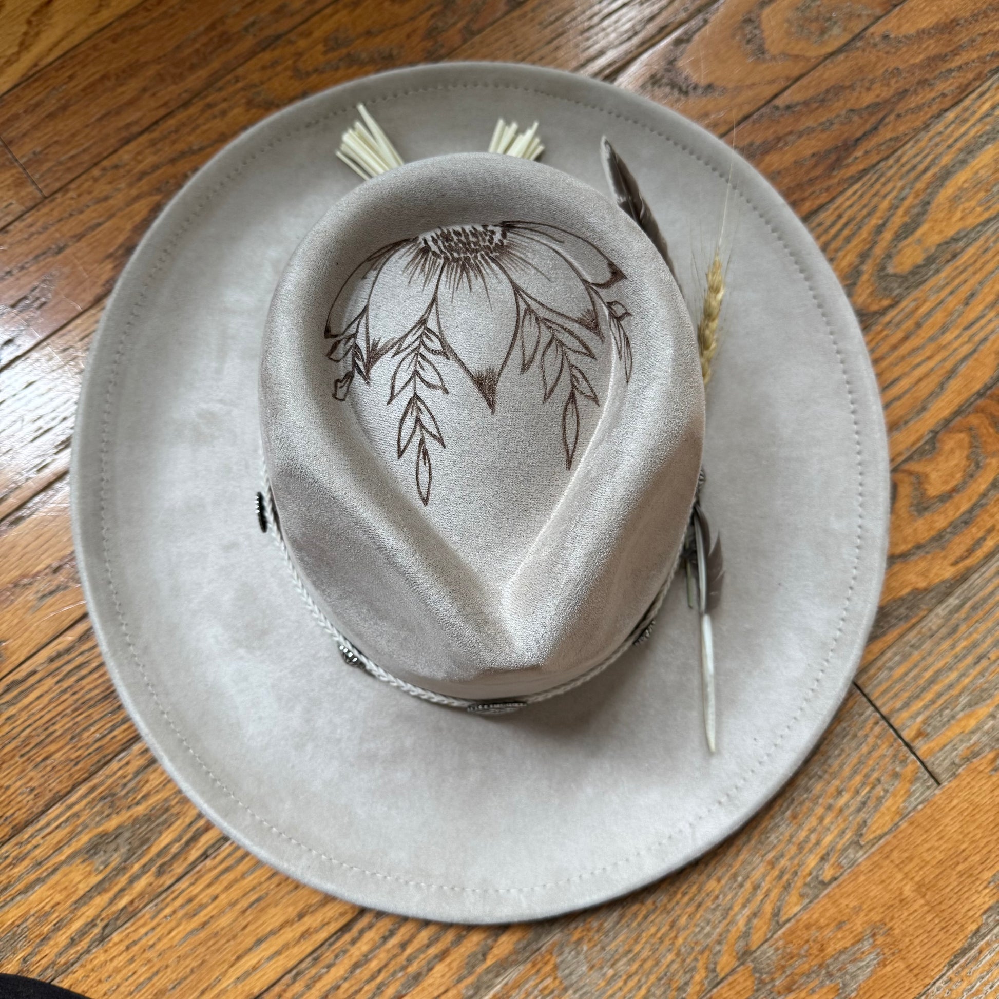 Hand drawn/ burned. Uniquely trimmed. This one of a kind hat is absolutely eye catching!