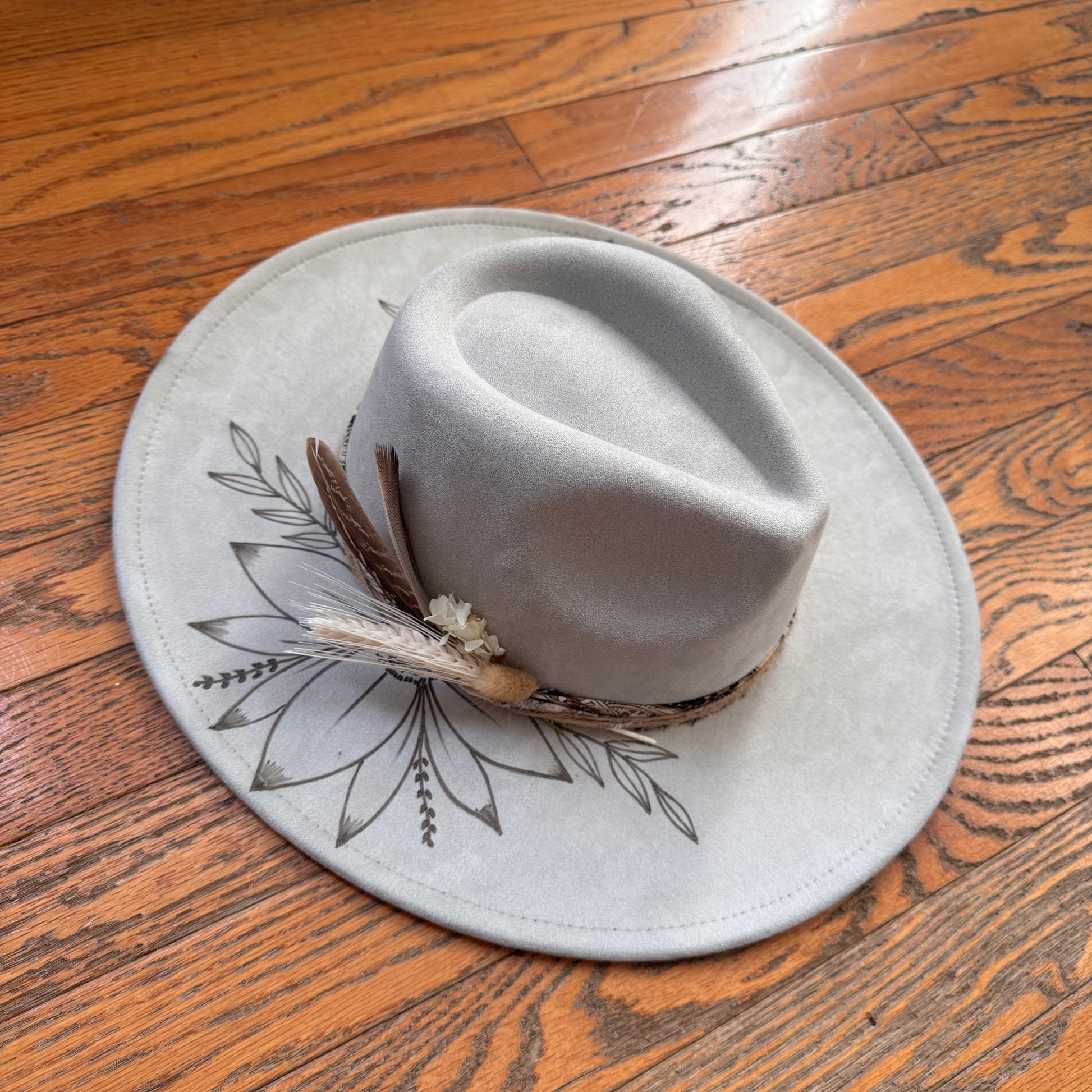 Hand drawn/ burned. Uniquely trimmed. This one of a kind hat is absolutely eye catching!