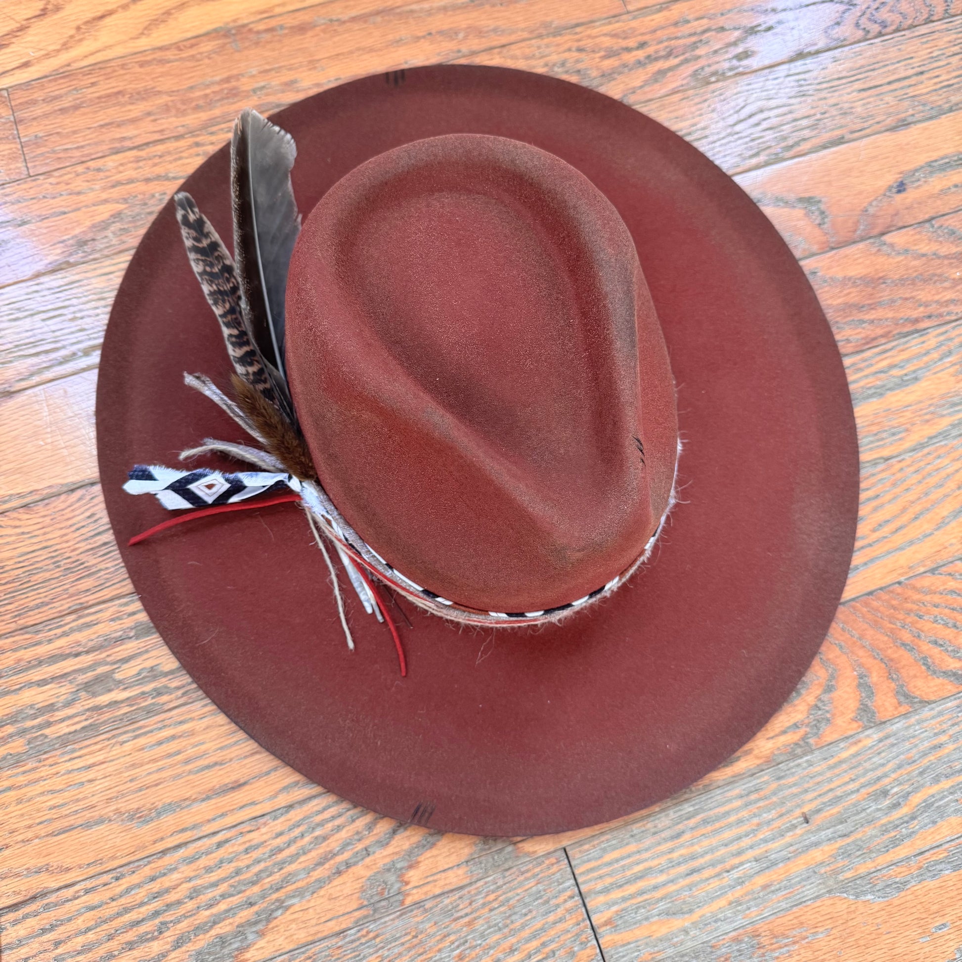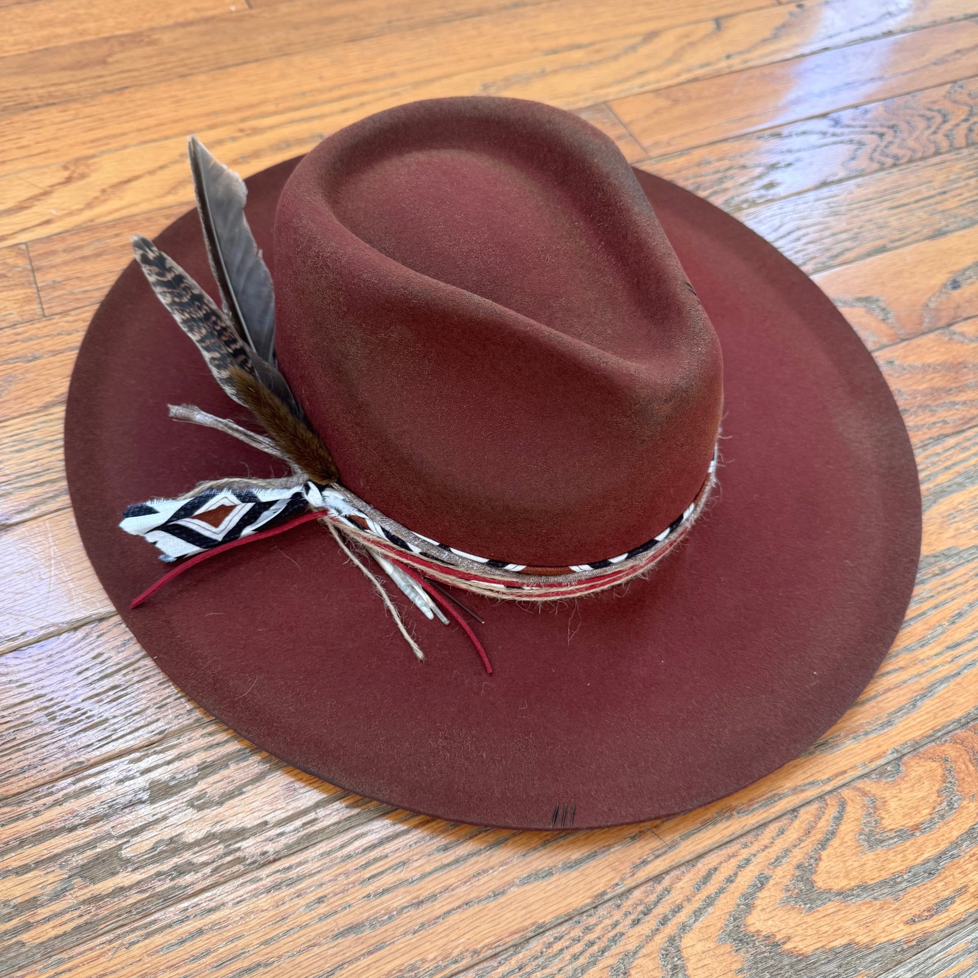 *Hand shaped, burned, and hand crafted. Uniquely trimmed. This one of a kind hat is absolutely eye catching!