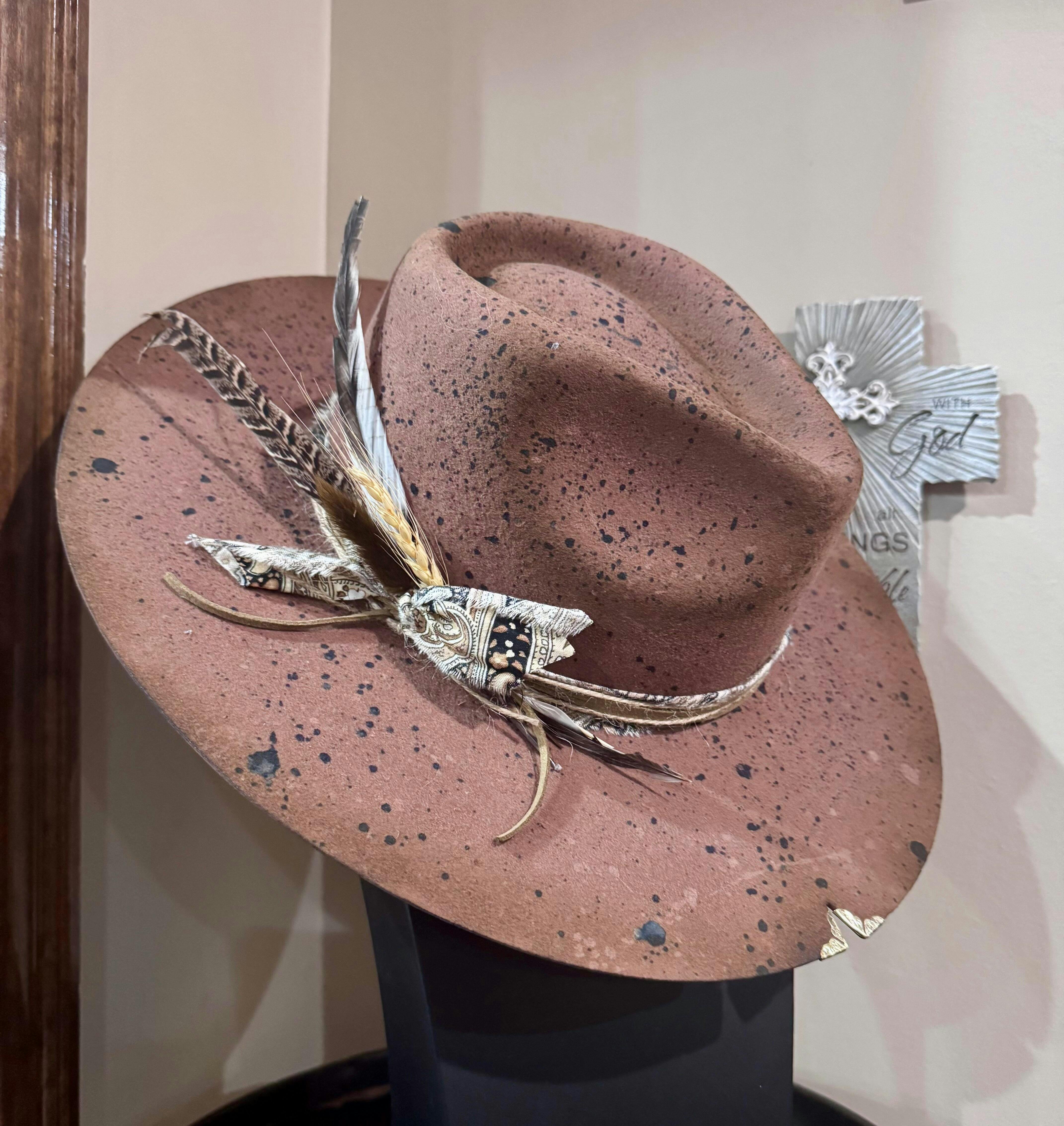 *Hand shaped, burned, and hand crafted. Uniquely trimmed. This one of a kind hat is absolutely eye catching!