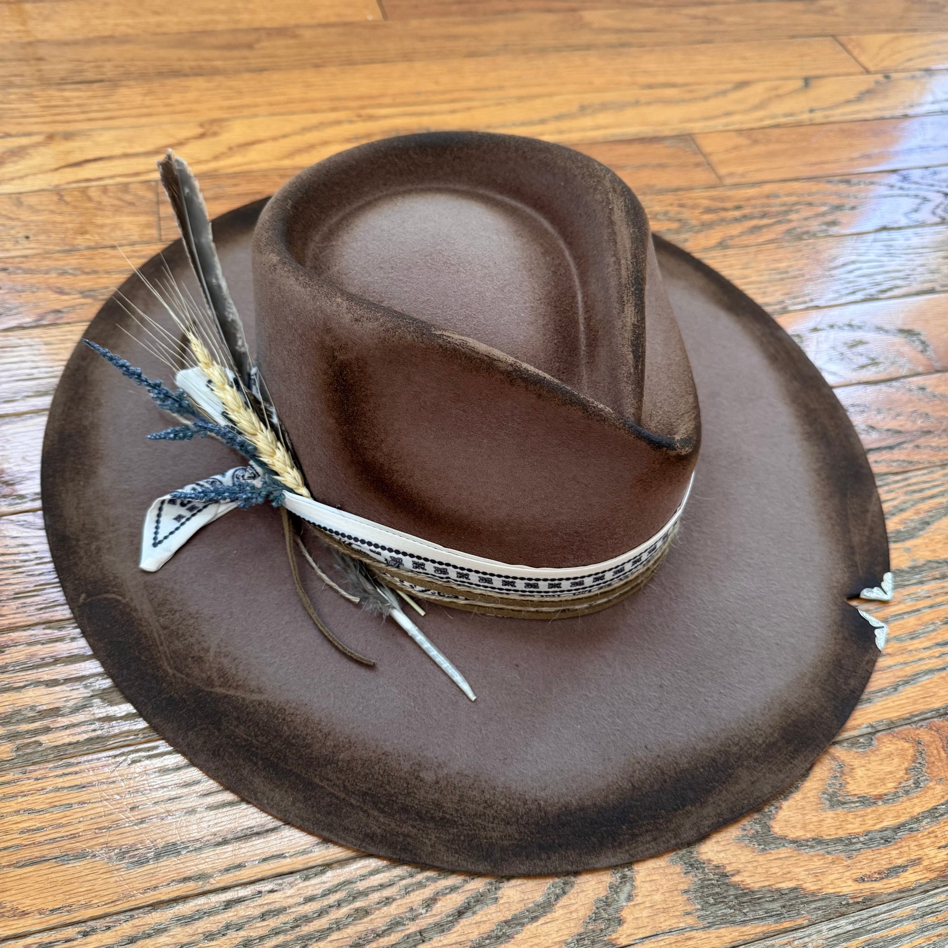 *Hand shaped, burned, and hand crafted. Uniquely trimmed. This one of a kind hat is absolutely eye catching!