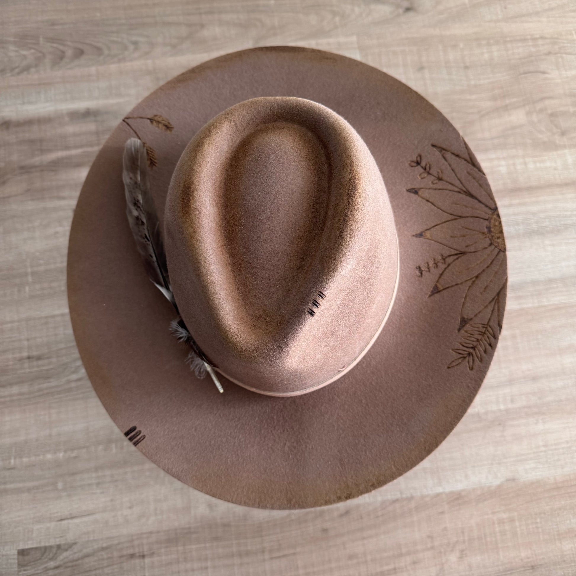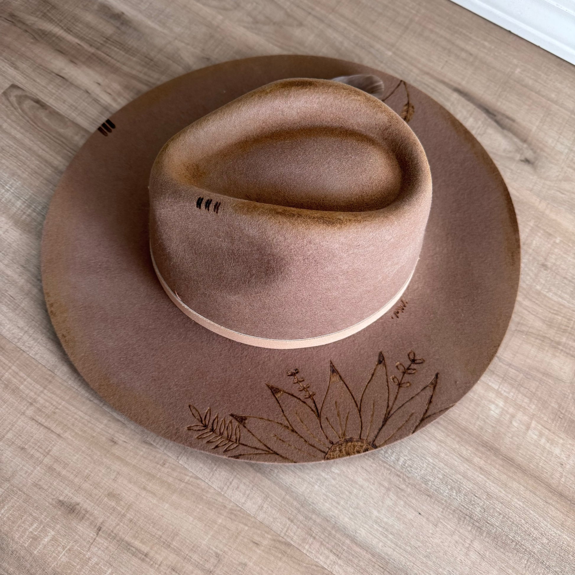 Hand etched, burned, and hand painted. Uniquely trimmed. Custom color. This one of a kind hat is absolutely eye catching!